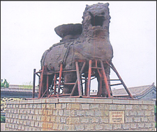 河北滄州鐵獅子又名“鎮(zhèn)海吼”鑄于后周廣順三年(公元953年),距今已有一千多年歷史。采用“泥范明澆法”鑄成,它的鑄造比美國和法國的煉鐵術(shù)早七八百年,所以鐵獅子在世界冶金史上具有里程碑的意義。鐵獅子通寬5.35米,身長6.30米,身高6.6米,體寬3.0米,重約40噸,素有“獅子王”的美譽。一千多年來它飽經(jīng)滄桑,在古滄州它被當(dāng)成神物供奉,現(xiàn)在鐵獅子已成為滄州的市徽。